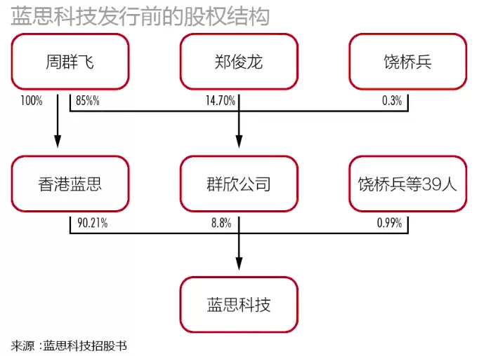 登陸資本市場讓周群飛一躍成為全球玻璃女王。上市前,周群飛通過香港藍思和群欣公司合計間接持有上市公司97.69%的股份,其夫鄭俊龍直接和通過群欣公司合計持有公司1.4%的股份,周群飛和鄭俊龍夫婦合計持有公司發(fā)行前99.09%的股份,是公司的實際控制人(附圖)。藍思科技發(fā)行前總股本為60600萬股,周群飛夫婦持股達60048.54萬股。