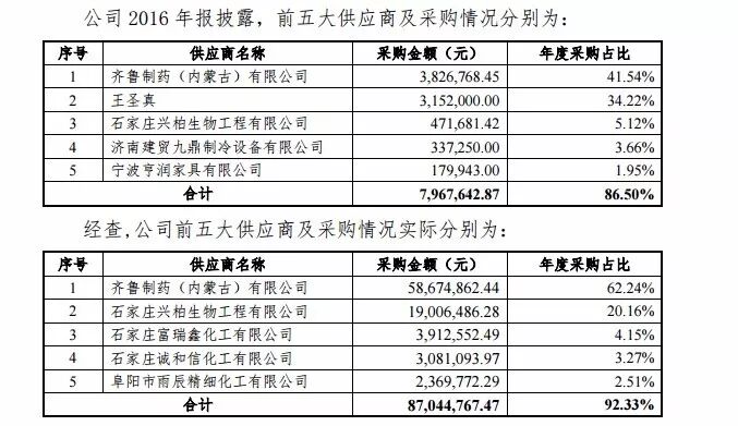 其中,該公司2016年第一大供應(yīng)商齊魯制藥(內(nèi)蒙古)有限公司(以下簡稱:齊魯制藥)當(dāng)期采購金額少計入超過5000萬,第二大供應(yīng)商石家莊興柏生物工程有限公司(以下簡稱:石家莊興柏)采購金額少計入1800多萬。