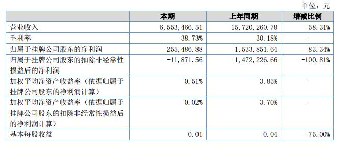 截止2018年6月30日,公司實現(xiàn)營業(yè)收入6,553,466.51元,較上年同期下降58.31%,歸屬于掛牌公司股東的凈利潤255,486.88元,較上年同期下降93.34%,歸屬于掛牌公司股東的扣除非經(jīng)常性損益后的凈利潤-11,871.56,較上年同期下降99.19%,。