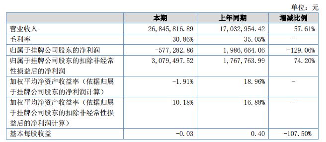 報(bào)告期公司營業(yè)收入26,845,816.89元,同比增長57.61%。本期歸屬于掛牌公司股東的凈利潤為-577,282.86元,同比下降129.06%,主要系股份支付確認(rèn)管理費(fèi)用所致。?