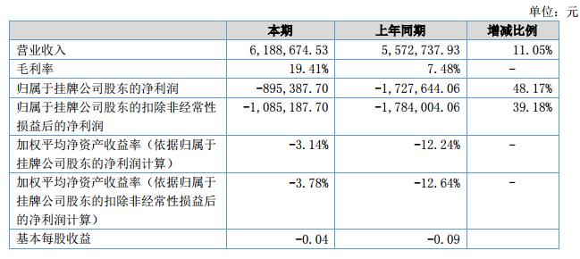 報告期內(nèi),公司實現(xiàn)營業(yè)收入6,188,674.53元,比上年同期增長11.05%;結(jié)轉(zhuǎn)營業(yè)成本4,987,211.25元,較上年下降3.27%;實現(xiàn)凈利潤-895,387.70元,比上年同期增長48.17%。?