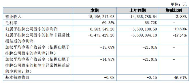 報(bào)告期內(nèi)公司共實(shí)現(xiàn)營(yíng)業(yè)收入15,196,217.93元,較上年同期(14,635,785.64元)增長(zhǎng)3.83%;公司凈利潤(rùn)為-6,613,515.47元,較上年同期(-5,551,015.87元)減少19.14%。?