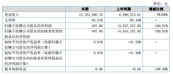 報(bào)告期內(nèi),公司實(shí)現(xiàn)營業(yè)收入1,218.42萬元,比上年同期增長74.54%。2018年上半年,企業(yè)實(shí)現(xiàn)歸屬于掛牌公司股東的凈利潤為0.05萬元,比上年同期增長100.01%;截至2018年6月30日,公司注冊資本1,000萬元,資產(chǎn)總額為368.64萬元,負(fù)債總額732.29萬元,凈資產(chǎn)-363.65萬元。?