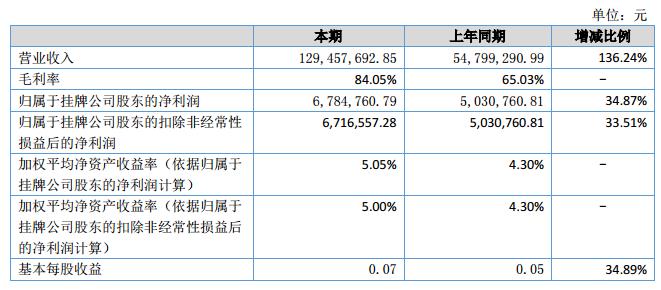 報告期內(nèi),公司實現(xiàn)營業(yè)收入129,457,692.85元,同比增加74,658,401.86元,增幅為136.24%;?凈利潤為6,784,760.79元,同比增加1,753,999.98元,增幅為34.87%。?