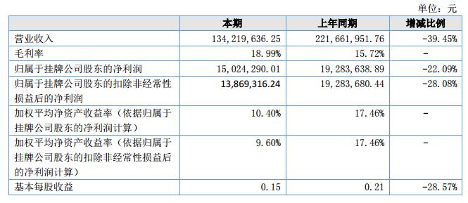 公司實(shí)現(xiàn)營(yíng)業(yè)收入134,219,636.25元,較上年同期下降39.45%;營(yíng)業(yè)成本108,727,275.83元,較上年同期下降41.80%;公司實(shí)現(xiàn)凈利潤(rùn)15,024,290.01元,較上年同期下降22.09%。?