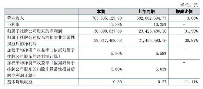 報(bào)告期內(nèi),公司實(shí)現(xiàn)營(yíng)業(yè)收入703,535,129.90元,與去年同期相比增長(zhǎng)3.06%;營(yíng)業(yè)成本624,115,469.39元,與去年同期相比增長(zhǎng)1.87%;實(shí)現(xiàn)歸屬于母公司股東的凈利潤(rùn)30,898,637.89元,與去年同期相比增長(zhǎng)31.90%。?
