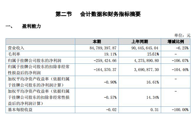報告期內(nèi),公司經(jīng)營實現(xiàn)營業(yè)收入 84,789,397.87 元,同比下降了 6.25%,公司主要的經(jīng)營模式為蘋果授權(quán)訂單,上半年訂單平穩(wěn),營業(yè)收入略降。公司凈利潤為-259,424.66 元,較上年同期下降 4,535,315.46 元,同比下降了 106.07%,主要系增加了研發(fā)投入,在營業(yè)收入略降的情況下,匯率波動及新增貸款增加了財務(wù)費用所致。毛利率由去年同期的 15.61%上升至 19.11%,主要系國外原材料進口供應(yīng)暢通,國內(nèi)原材料價格穩(wěn)中有降,致使平均采購單價較去年同期下降所致。