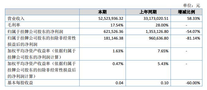 報(bào)告期內(nèi),公司實(shí)現(xiàn)營(yíng)業(yè)收入5,252.39萬元,同比增長(zhǎng)58.33%,實(shí)現(xiàn)凈利潤(rùn)62.15萬元,同比減少54.07%。資產(chǎn)總額5,396.52萬元,比上年度末增長(zhǎng)1.11%,凈資產(chǎn)3,854.95萬元。?