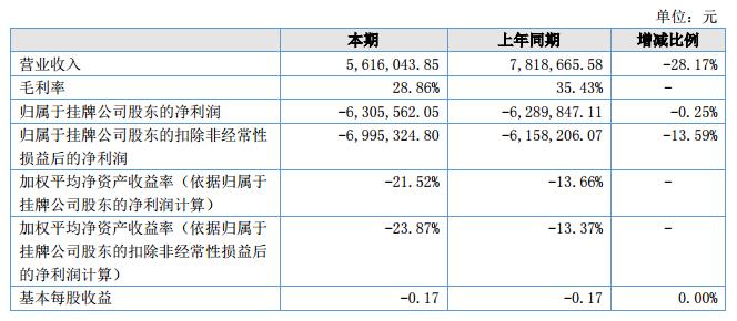 報告期內(nèi)公司實現(xiàn)營業(yè)收入5,616,043.85元,較上年同期營業(yè)收入7,818,665.58元降低了28.17%;凈利潤-6,305,562.05元,較上年同期-6,289,847.11降低了0.25%。?