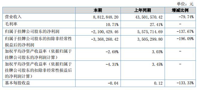 報(bào)告期內(nèi)公司已經(jīng)實(shí)現(xiàn)營(yíng)業(yè)收入881.28萬(wàn)元,同比下降79.74%;營(yíng)業(yè)成本為786.88萬(wàn)元,同比下降75.08%;凈利潤(rùn)為-210.04萬(wàn)元,同比下降135.62%。