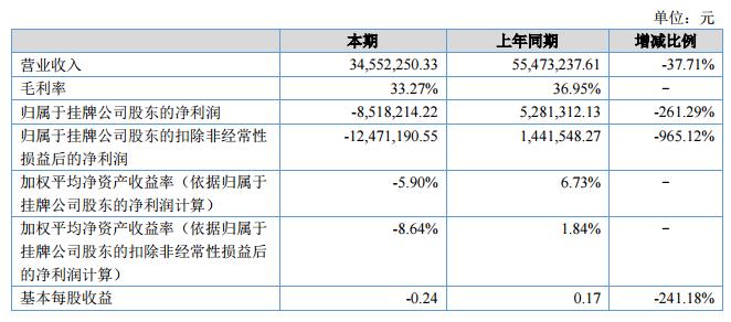 報(bào)告期內(nèi),公司實(shí)現(xiàn)營(yíng)業(yè)收入3,455.23萬元,比上年同期降低37.71%;歸屬于掛牌公司股東的凈利潤(rùn)-851.82萬元,比上年同期降低261.29%。截至2018年6月30日,總資產(chǎn)為20,974.32萬元,總資產(chǎn)增長(zhǎng)率3.87%,歸屬于母公司凈資產(chǎn)為14,985.08萬元。?