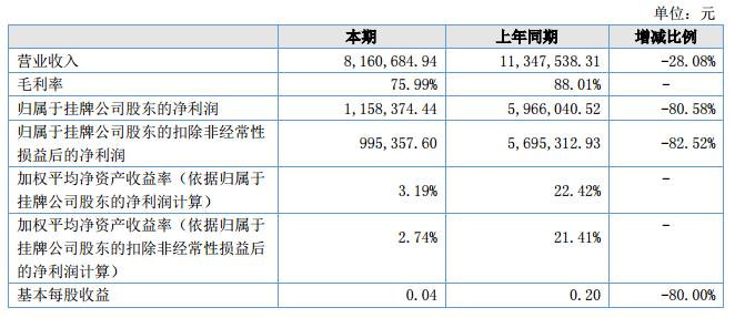 報告期內(nèi),公司實現(xiàn)營業(yè)收入8,160,684.94元,較上年同期減少28.08%,主要原因系公司大客戶中國食品藥品檢驗院自2018年開始對供應(yīng)商政策采取競標(biāo)模式,政策執(zhí)行初期,其內(nèi)部采購結(jié)算流程不明確,致使報告期內(nèi)對其銷售收入減少了52.42%。歸屬于掛牌公司股東的凈利潤1,158,374.44元,較上年同期減少80.58%,報告期內(nèi)營業(yè)收入比同期減少28.08%,毛利率因研發(fā)創(chuàng)新等投入的增加減少了12.02%,收入和毛利率的減少是影響凈利潤減少的主要原因。?
