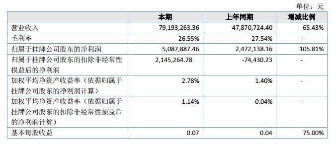 上半年度實(shí)現(xiàn)營(yíng)業(yè)收入7,919.33萬元,較上年同期4,787.07萬元,增加3,132.26萬元,同比增加65.43%;實(shí)現(xiàn)凈利潤(rùn)565.77萬元,較上年同期244.22萬元,增加321.55萬元,同比增加131.66%。?
