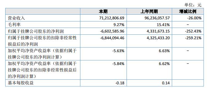 報告期內,公司實現(xiàn)營業(yè)收入7,121.28萬元,較去年同期9,623.61萬元下降26%;營業(yè)成本6,461.17萬元,較去年同期8,140.31萬元下降20.63%;歸屬于掛牌公司股東的凈利潤-660.26萬元,較去年同期433.17萬元減少252.43%;毛利率由15.41%下降至9.27%。