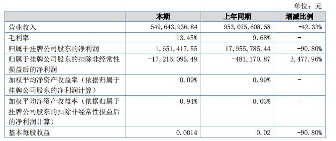 報告期內(nèi)公司實現(xiàn)營業(yè)收入549,643,936.84元,同比下降42.33%;凈利潤13,514,360.13元,同比下降64.26%;歸母凈利潤1,651,417.55元,同比下降90.80%;扣非歸母凈利潤-17,216,095.49元,同比下降3477.96%;毛利率13.45%,同比上升3.77個百分點;截至2018年6月30日,公司總資產(chǎn)為2,818,951,592.21元,同比下降2.82%。?
