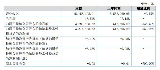 報(bào)告期內(nèi)公司實(shí)現(xiàn)營業(yè)收入1,515.81萬元,較去年同期下降2.57%,凈利潤-328.95萬元,較去年同期下降536.50%。毛利率為18.54%,去年同期27.18%,同比下降31.79%。?
