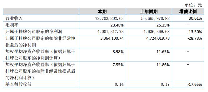 報(bào)告期內(nèi)公司實(shí)現(xiàn)營業(yè)收入7,270.32萬元,較上年同期增長30.61%;凈利潤400.13萬元,凈利較上年同期下降13.69%;歸屬于掛牌公司股東的扣除非經(jīng)常性損益后的凈利潤336.40萬元;截至2018年6月30日,公司總資產(chǎn)13,950.30萬元,較本報(bào)告期初增加36.47%;凈資產(chǎn)5,784.09萬元,較本報(bào)告期初增加35.95%。?