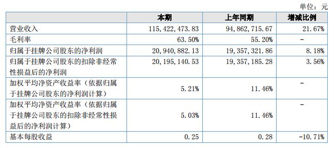 報告期內(nèi)公司營業(yè)收入達(dá)到1.15億元,較上一年度同比增長21.67;實現(xiàn)凈利潤2,094.09萬元,較2017年上半年度同比增長8.18%?。