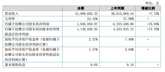 報告期內(nèi),公司實現(xiàn)營業(yè)收入51,688,683.33元,較去年同期下降7.72%,發(fā)生營業(yè)成本39,066,656.40元,較去年下降4.47%,毛利率為24.42%,毛利率呈下降趨勢。報告期內(nèi),公司實際凈利潤1,846,039.97元,較去年同期下降70.85%,經(jīng)營活動產(chǎn)生的凈現(xiàn)金流量為-2,852,744.57元,較去年同期11,463,766.32元下降124.88%。?