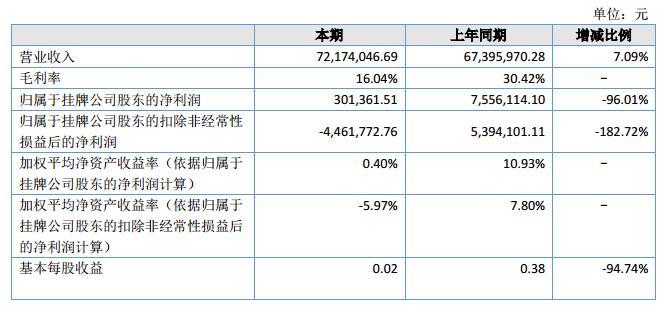 報(bào)告期內(nèi),公司實(shí)現(xiàn)營(yíng)業(yè)收入72,174,046.69元,較上期增長(zhǎng)4,778,076.41元,同比上升7.09%,凈利潤(rùn)301,361.51元,較上期下降7,254,752.59元,同比下降96.01%。?