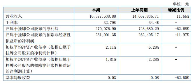 報(bào)告期內(nèi)實(shí)現(xiàn)銷售收入1,637.76萬元,較去年同期增長11.66%,增長原因?yàn)楣旧弦荒甓人e累開發(fā)的新客戶訂單穩(wěn)步增長所致;報(bào)告期毛利率為32.79%,比去年同期下降4.68個百分點(diǎn),主要是除油清洗劑毛利比去年同期下降11.64%以及公司采購原材料為石油衍生品,平均采購價格對比上年度增長10%所致;報(bào)告期內(nèi)實(shí)現(xiàn)凈利潤27萬元,比去年同期下降了62.68%,主要原因?yàn)楣旧弦荒甓忍幹霉潭ㄙY產(chǎn)收益53萬元所致。?