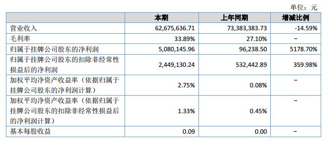 報告期內(nèi)公司實現(xiàn)營業(yè)收入6,267.56萬元,同比下降14.59%;凈利潤508.01萬元,同比增長5178.70%。截至2018年6月30日,公司總資產(chǎn)為23,477.50萬元,同比增長6.21%;歸屬于掛牌公司股東的凈資產(chǎn)為18,721.22萬元,同比增長2.79%。?