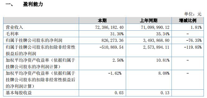 挖貝網(wǎng)訊 9月16日消息,戈蘭迪(證券代碼:832140)近日公布的2018年半年報顯示,截至2018年6月30日,企業(yè)實現(xiàn)營收7238.62萬元;歸屬于掛牌公司股東的凈利潤為83萬元。