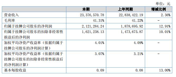 公司在2018年1月至6月營業(yè)收入為79,752,374.75元,較上年同期增長3.9%;歸屬于母公司的凈利潤為10,457,793.87,比上年同期下降31.12%。截至2018年6月30日,公司總資產(chǎn)為115,307,768.88元,凈資產(chǎn)為80,121,370.24元。?